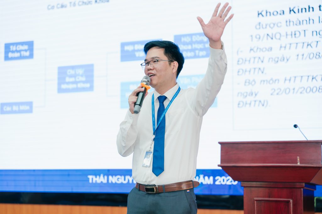 Trong phần phát biểu khai mạc, TS. Vũ Xuân Nam – Trưởng Khoa Kinh tế & Quản trị đã gửi lời chúc mừng nồng nhiệt đến các Tân sinh viên Khoá 24, đồng thời bày tỏ niềm tự hào khi Khoa tiếp tục chào đón thêm gần 800 gương mặt trẻ đầy khát vọng gia nhập đại gia đình ICTU. Thầy nhấn mạnh, Khoa Kinh tế & Quản trị hiện đang đào tạo nhiều ngành học có tính ứng dụng cao như: Thương mại điện tử, Quản trị văn phòng, Hệ thống thông tin quản lý, Kinh tế số. Với 6 chương trình đào tạo, gồm: