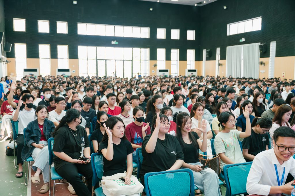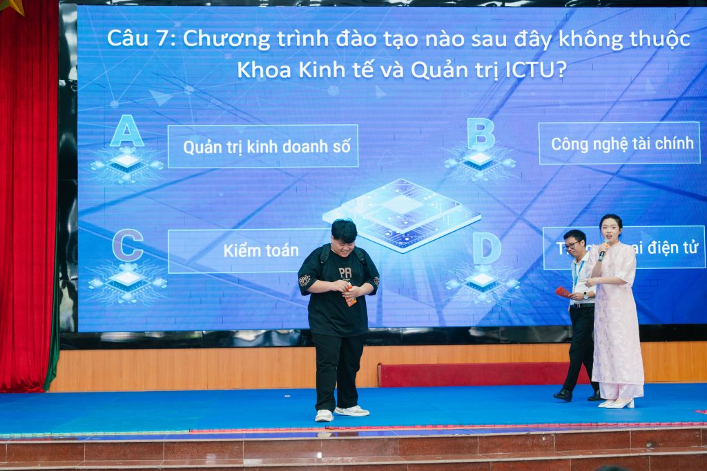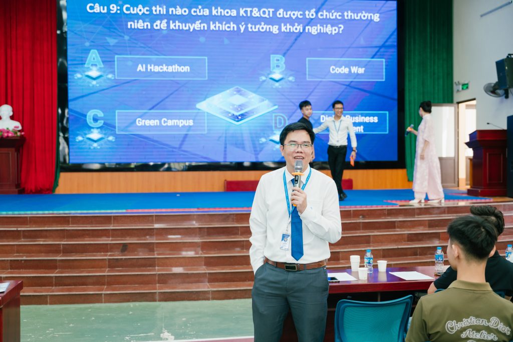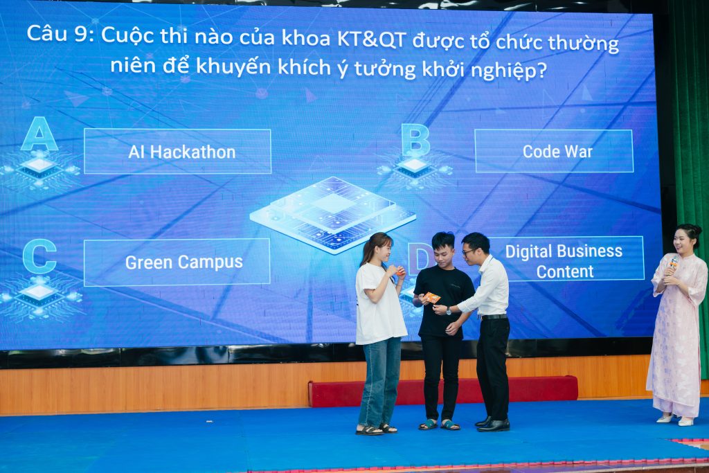 Để tạo không khí hào hứng, Ban Tổ chức đã tổ chức chương trình trò chơi giải đáp câu hỏi nhanh về kiến thức Khoa, Nhà trường và đời sống sinh viên. Các phần thưởng hấp dẫn được trao cho những bạn trả lời đúng và nhanh nhất đã khiến hội trường trở nên sôi nổi, thu hút đông đảo sinh viên tham gia. Hoạt động này không chỉ mang đến niềm vui mà còn giúp các bạn tân sinh viên hiểu thêm về môi trường học tập, rút ngắn khoảng cách và nhanh chóng hòa nhập với đại gia đình Khoa Kinh tế & Quản trị.